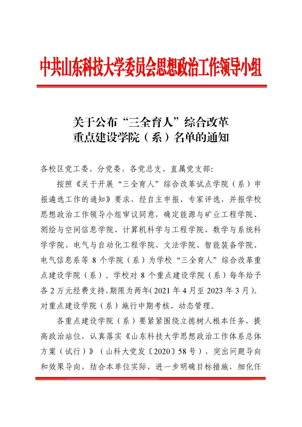 校“三全育人”综合改革重点建设学院(系)